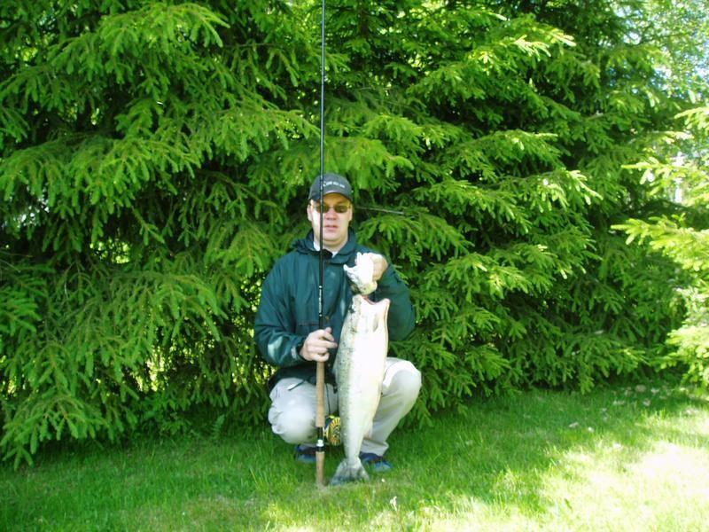 Kala näyttäytyi ensin niskalla, mutta ei ollut kiinnostunut perhoista. Kävin alemmilla koskilla ja palasin takaisin vähätainille ja ensimmäisellä laskulla lohi iski kiinni. Kala käyttäytyi rauhallisesti ja 10 minuutin väsyttelyn jälkeen sai nostaa pyrstöstä rannalle.