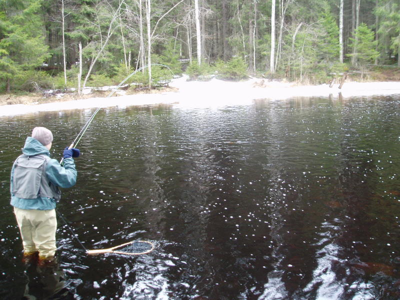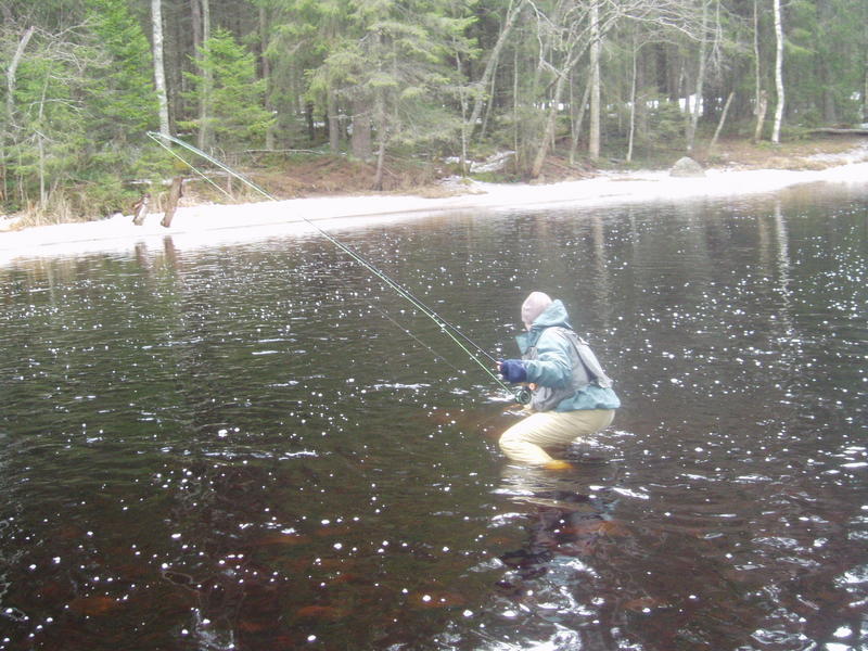 Heiteltiin kaverin kans joen yläosilla ensin parisen tuntia tyhjää. Palailimme alaspäin ja kysyimme siellä olevalta tuttavalta, että onko ollut tapahtumia. Hän kertoi saaneensa pari laihaa taimenta, jotka oli päästänyt takaisin.