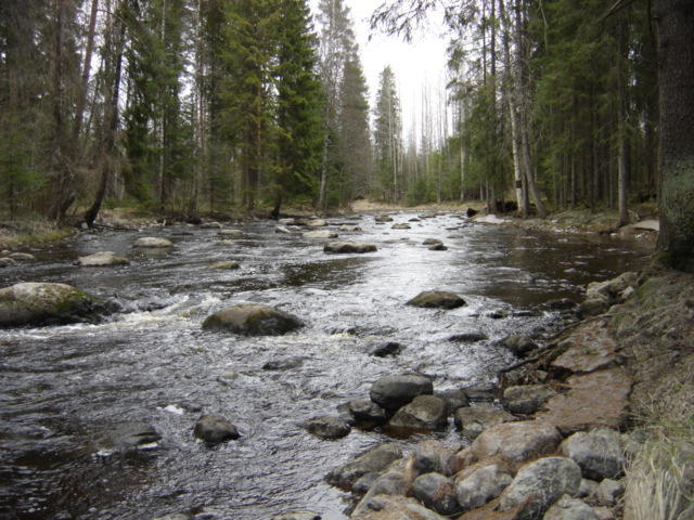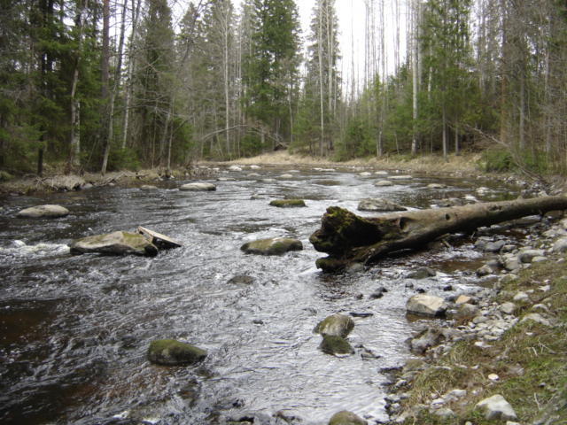 Siittä eteenpäin vielä noin 150 metriä. Siinä suvannossa joka on välillä, on toisinaan kirjoja, suvannon puolivälissä on kaatunut puu, jonka vieressä näkyy iso kivi. Kokeile siitä kiven vierestä alavirran puolelta.
