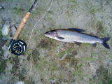 Maanantaina rauhoiutksen päätyttyä vedettiin löysät pois Fierranjoella, vähän kuin lämmittelynä. Kova tuuli haittasi heittoa, mutta Late onnistui saamaan n. kiloisen harrin ja mulla oli joku epämääräinen äkillinen siiman pysähdys. Oltiin siinä n. klo 23 asti, kunnes lähdimme Jannen kanssa kokeilemaan harria Akukosken niskalta. Pintakäyntiä oli vähän, mutta yhden 43cm harjuksen onnistuin saamaan.