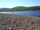 Tiistaiaamuna lähdettiin Dalvadakseen. Kamala helle koko päivän, mutta apinan raivolla hakattiin. Jossain vaiheessa kyllästyin ja lähdin heittämään harjusta jonkin matkaa ylemmäksi. Sieltä sain 4 harjusta, n.30-39cm. Mutta tietysti alempaa oli sillä välin vedetty Matin toimesta ylös kurssilaisten ensimmäinen titti. Itselläni meni myös lohen heittelyksi ja yhdessä vaiheessa sitten tärähti, klassiseen Green Highlanderiin. Kala tuli ensin vastaan rauhallisesti, mutta sitten se "heräs". Muutamassa sekunnissa lähti 30 metriä narua, ja kivaa oli! Kala pyyteli välillä siimoja mutta sain sen kumminkin aika lähelle rantaa ja olisin jo yrittänyt sitä maihin, mutta kala oli eri mieltä... irti prkl! Lopetin päivän kalastuksen siihen, ei sais mennä mokaileen näitä kerran-vuodessa-tilaisuuksia.