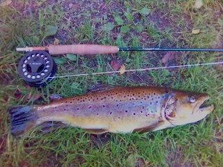 Siinä sitä viskoessani kovinpaan kuohuun, noin kolmannella kerralla siima kiristyi ja eikun adrenaliini virtaamaan!:D Hetken ajattelin että kestääköhän perhana 0,16 kärki, kun olin sitten unohtanut vaihtaa sen paksumpaan. Sen verran rajusti taimen poukkoili joessa, yrittäen löytää jotain piilopaikkaa oksien alusista ja kiven takusista, mutta minä pysyin kovana;) ja lopulta haavissa lepäsi väsynyt taistelija! JES! Elämäni ensimmäinen mitta-taimen oli narutettu!