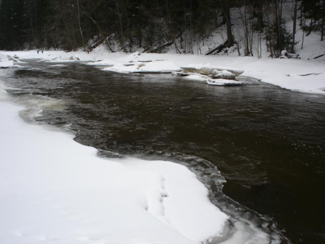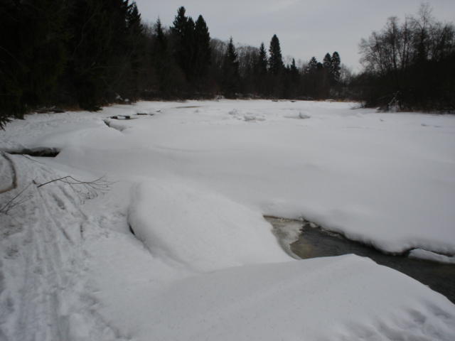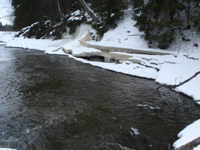 Kauden avaus Pitkälläkoskella. Saavuin koskelle 10.30, kävelin riippusillalle katsomaan tilanteen. Sillan ylä ja alapuolella oli vapaata vettä, mutta muuten näytti aika jäiseltä. Ajattelin käydä katsomassa kosken alaosat, muutta surukseni huomasin alaosan olevan täysin jäässä, no ihme!!!