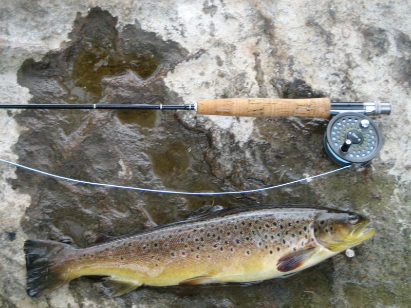 Sitten päätin kokeilla pienestä uomasta olisiko ketään kotona, ensimmäinen heitto kiven taakse pieneen peiliin ja samatien kun perho kosketti veden pintaa niin ampui taimen ilmaan tinseli suussa väänsi hyvin pitkän aikaa ,mutta suostui kuvattavaksi ja siitä vapauteen.