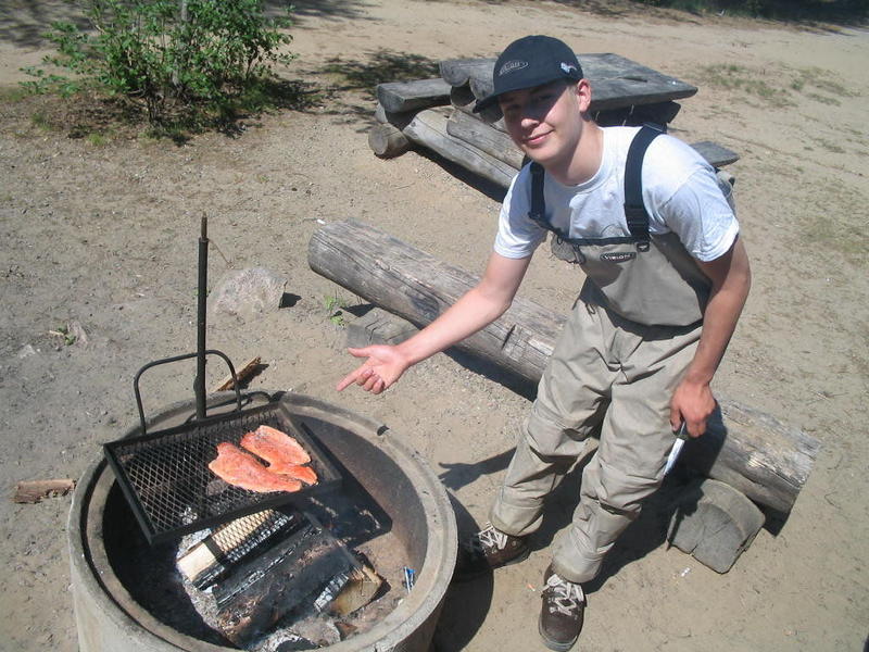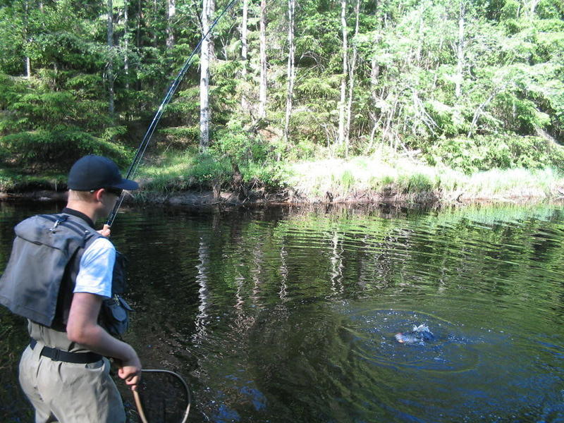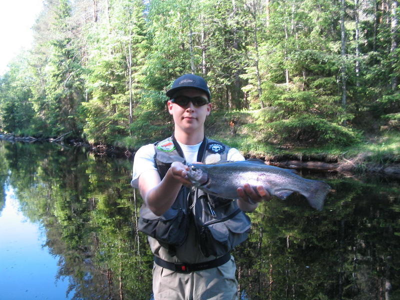 Lähdettiin kalalle Palsankoskelle tyttöystäväni Flyfisheten kanssa. Päivä oli erittäin lämmin, ihan niin kuin saunassa! =) Vähän väliä oli heiteltävä vettä naamariin, että pysyi tajuissaan! Kuitenkin kala söi. Aamulla sain yhden kirjolohen nro 12# pinkillä leechillä, wolframi kuulan kera.