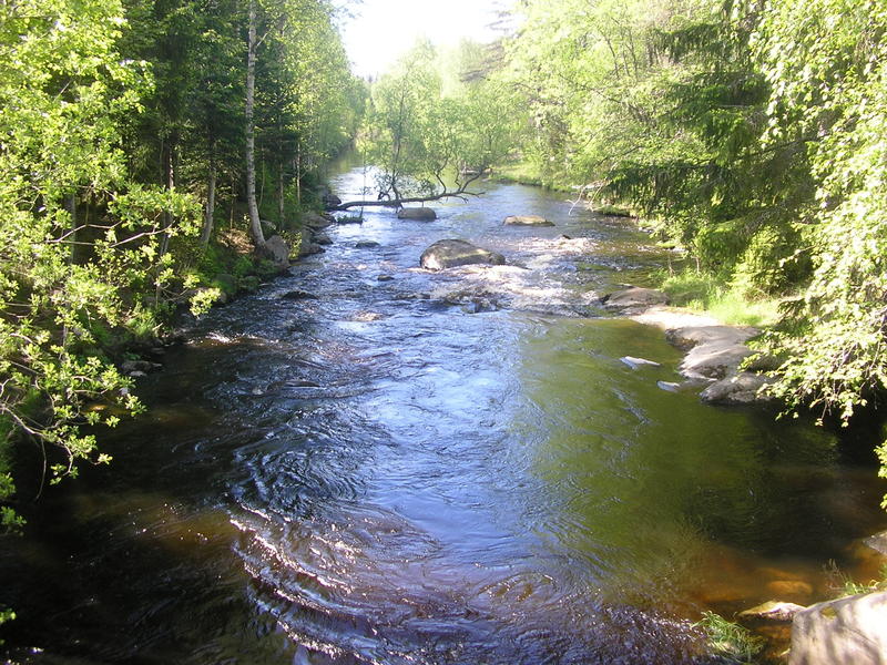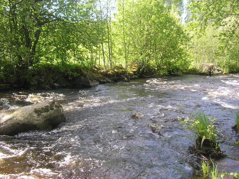 Ensiksi menimme joen alimmallle koskelle kuorekoskelle, jossa aluksi vain näkyi komeita taimenien loikkia ja tärppejä. Itse testailin liitsejä, larvoja ja pupia, mutta ei kun ei. 11 aikoihin siirryimme koskelankoskelle, mikä on näistä koskista pisin, noin kilometrin.