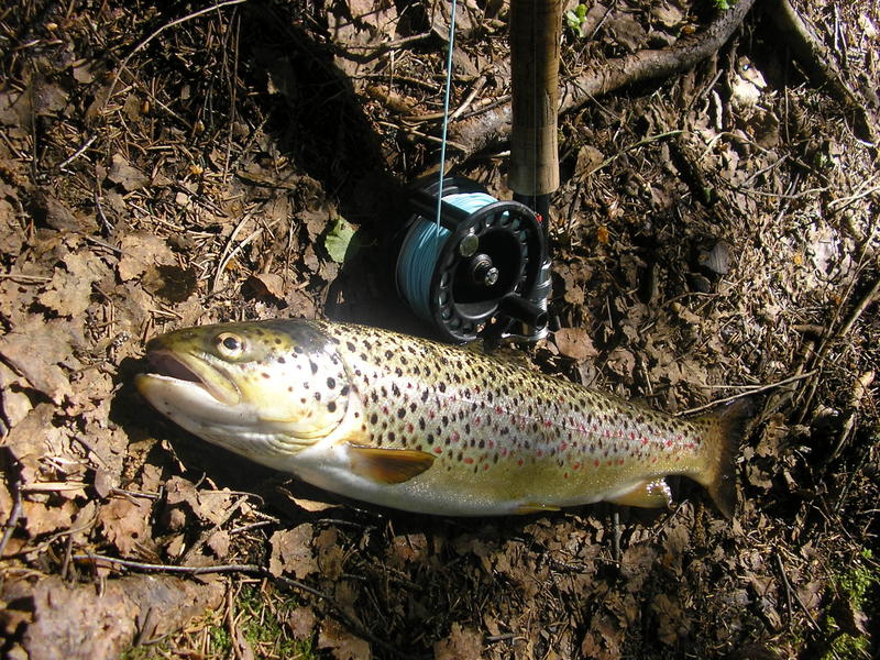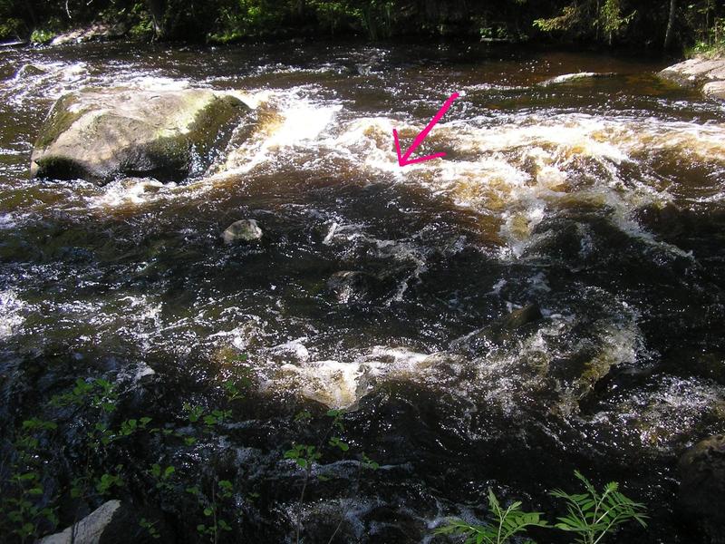 Lähdimme noin yhden aikoihin uudestaan kuorekoskella käymään, josko nyt vaikka pysyisi. iskä heitteli keskelle koskea semmoitteeseen pienenpieneen monttuun, jossa sanoi että taimen kävi sen vieheen perässä, itse tulin siihen noin vartin päästä, ja heitin siihen monttuun ison mustan liitsin ja heti paukkui komea taimen.
