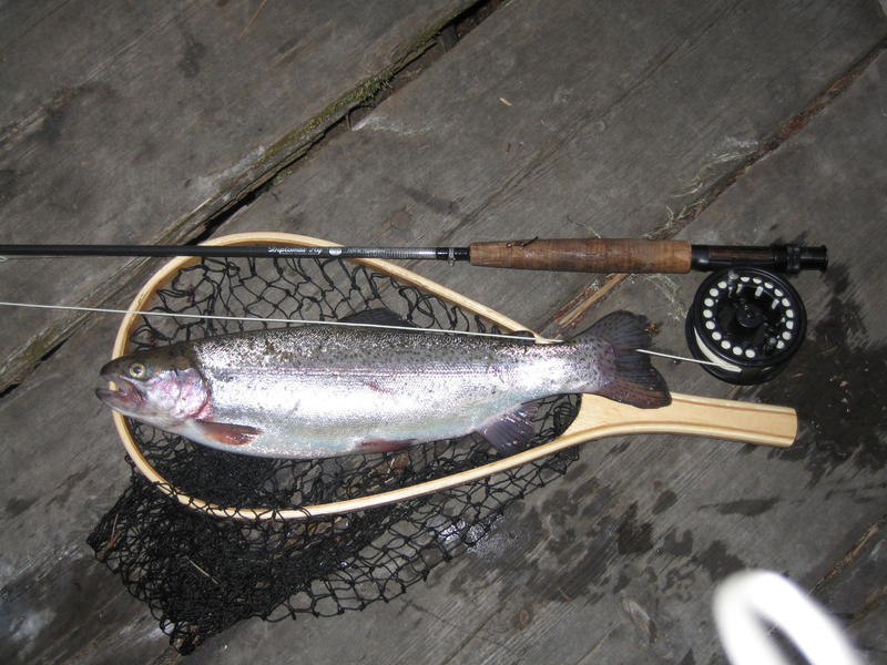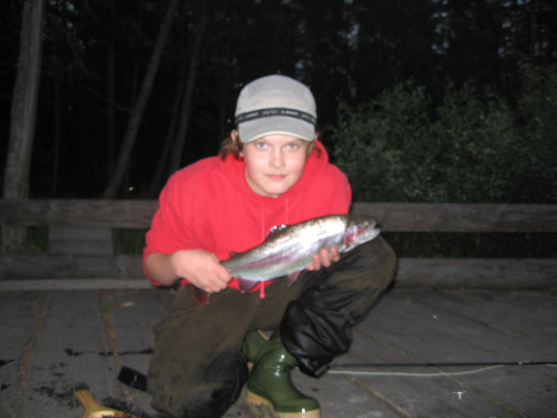 Aamu alkoi koittaa ja vaihdoin hieman kirkaampaan perhoon, laitoin siimanpäähän kuulapää liitsin ja muutaman heiton jälkeen taimen oli kiinni koukussani, no RAPS! ja peruke poikki. Onneksi minulla oli vastaavanlainen perho rasiassani ja samaan paikkaan uudestaan ja toisella heitolla tane kiinni. No se tuli pienen väsyttelyn jälkeen rannalle, mutta totesimme sen ala mittaiseksi ja päästin sen kasvamaan. Sitten isällä nappasi ja hän noukki kauniin taimenen haaviin. Ne kalat riittivät meille jo liiankin hyvin ja lähdimme ajelemaan kotia kohti.