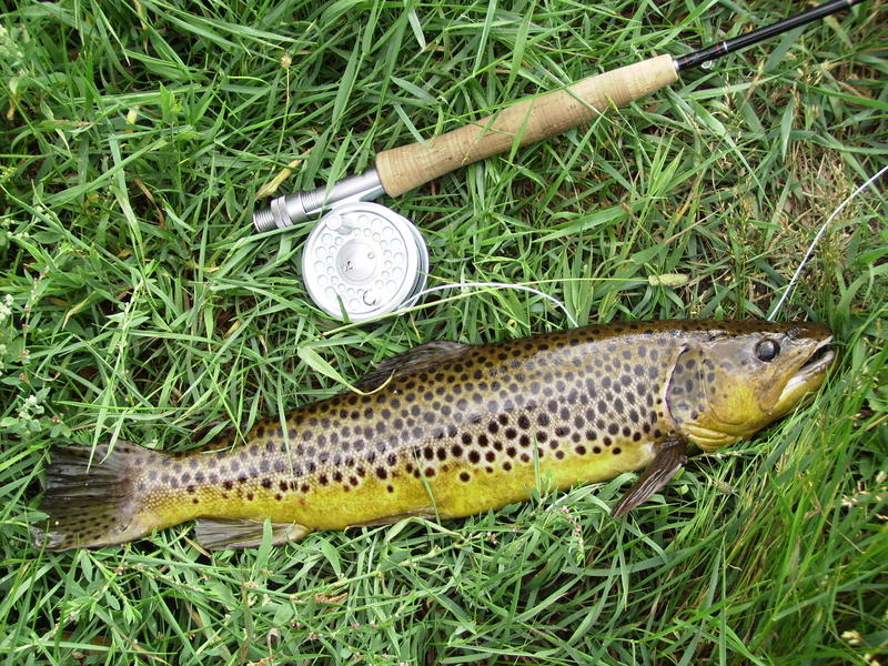 Huonosti otti kala aluksi. Pari kertaa kävi perhoa hamuamassa, kun sai heitettyä tuikin viereen, mutta eivät tarttuneet. Noin 16.30 huomasin yhden kalan käyvän jatkuvasti pinnassa samassa paikassa. Olin vaihtanut Hare`s ear nymfiin pinturin jälkeen, koska siihen ei napannut. 16.45 sain lepän takaa tarjottua nymfin tuikin eteen. Huomasin siiman liikahtavan varovasti ja vastaiskussa tunsin kalan tarttuvan. Kala oli melko pirteä ja jouduin ottamaan kelan jarrunkin peliin parin pitemmän syöksyn aikana. Ylös nousi 50 cm taimen. Kala oli kauniin värinen, mutta hiukan laiha, vaikka vastaan laittoikin. Punnitus määritti painoksi 1.2 kiloa. Päästin kalan kartuttamaan kiloja.