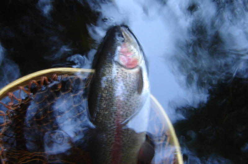 Sitten menin laavulle ja pidin pienen eväs tauon. Tauon jälkeen menin takaisin ylös rauhoitusalueen kyltin luokse jossa yksi kala olikin heinien seassa, pari heittoa ja kala kiinni...kala ylös ja reppuun. Tähän olikin ihan hyvä lopettaa kun lupaakaan ei ollut jäljellä kun kymmenisen minuuttia. Muita kalastajiakin oli ja kaala tuntuivat saavan.