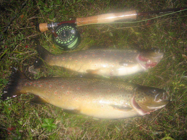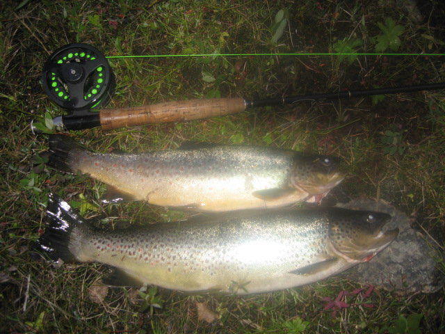 Illalla painelimme taas kalalle. Kalan tulo oli edelleenki heikkoa, näimme kyllä paljon kalaa kun ne söivät runsaasti kuoriutuvaa suurikokoista päiväkorentoa(?).Ja tietenkään ei ollut yhtään ainutta päiväkoretojäjitelmää tullut otettua mukaan!Markus löysi onneksi omasta pakistaan kuoriutuvan vesiperhosenjäjitelmän jolla oli noussut siipi pystyyn, ja arvelimme sen saattavan kelvata. Eikä tarvinnut montaa heittoa kunnes hyvänkokoisen näköinen taimen oikeen hyppäsi perhoon, ja siitähän seurasi se että siimaa vietiin!Aika pian kala oli haavissa, 45senttiä luonnon kaunotarta!Kelpasi lähtiä saunaan. Ja hyvät löylyt saatiinki!