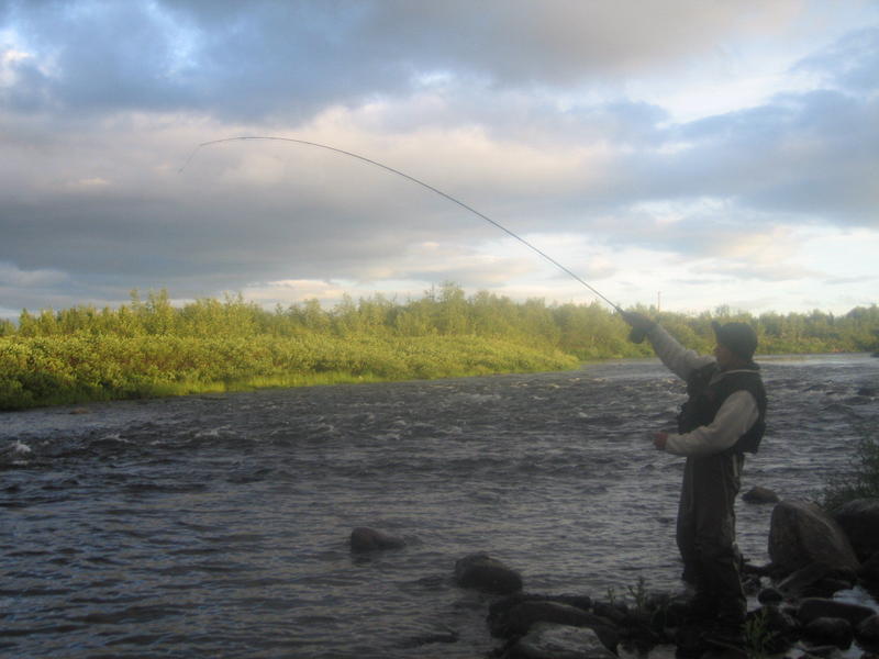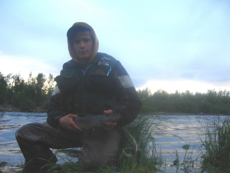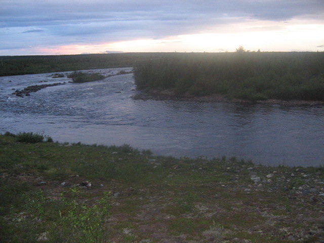 Yöllä noin klo12 alkoi taas raju syönti kaloilla, nyt hiukan ylämpänä ku edellisenä päivänä.Kalat ruokailivat suoraan leirimme kohdalla vasta rannalla, mutta joen keskellä virtasi liikaa, mikä esti rannan tehokkaan kalastamisen leirin puoliselta rannalta.Kova virta esti yli kahlaamisen lähistöllä, mutta lähdimme kuitenkin Niilon kanssa yrittämään ylitystä ylempää. Jouduimme kahlaamaan koskea ylös varmaan yli kilsan mutta viimein löysimme kohdan josta juuri ja juuri uskalsi kahlata yli kun pisti kellunta liivit päälle. No me selviydyimme leirin kohdalle vasta rannalle rämmittyämme pajupusikossa varmaan puolisen tuntia sääsket niskassamme.