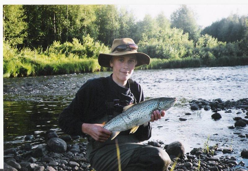 Alas päästyämme menimme koivumutkaan josta lähdimme alapäin jokea saamatta mitään. Ei muuta, kuin takaisin ylös Koivumutkaan. Minä alotin eka laskuni ja sitten isäni, kun olin saanut laskun päätökseen aloin räpsiä kuvia sieltä täälä kunne tuli kutsu haavimieheksi. Isäni väsyttelin kalaa ja minä yritin epätoivoisesti sohia sitä haaviin" On meinaan yllättävän vaikeeta" Tuli siinä uimassakin käytyä samalla, mutta onneksi kaikki päättyi meidän voitoksi ja eka paanajärveläinen oli rannalla. 58cm ja 1,7 kiloa. Siinä sitten tulin vähän kateelliseksi ja läksin alempaan mutkaan missä on sorarinne. Ei kauaa mennyt, kun tunsin siiman päässä jotain heikkoa nypytystä ja vastaisku samassa kala hyppäsi ilmaan ja lähti virran reunustaa ylös ja hyppi kahdesti ihan nenäni edessä. Väsytysta kesti ja kesti, kun kalalla ei näyttänyt menohaluja liiemmin olevan. Kivillä piti kalaa viskoo, että sai sen johonkin päin liikkumaan. Noin 100 metriä alempana ja yli 40 minuuttia väsyteltyäni alkoi kala olla jo aika kuitti viellä yksi komea hyppy ja pian haavissa JES!!!!!. Kala oli 58cm ja 2 kiloa hieman siis pulleampi, kuin edellinen. Tähän oli hyvä lopettaa kuusingin reissu, kun lupaakin oli enään 10 minuuttia jäljellä.