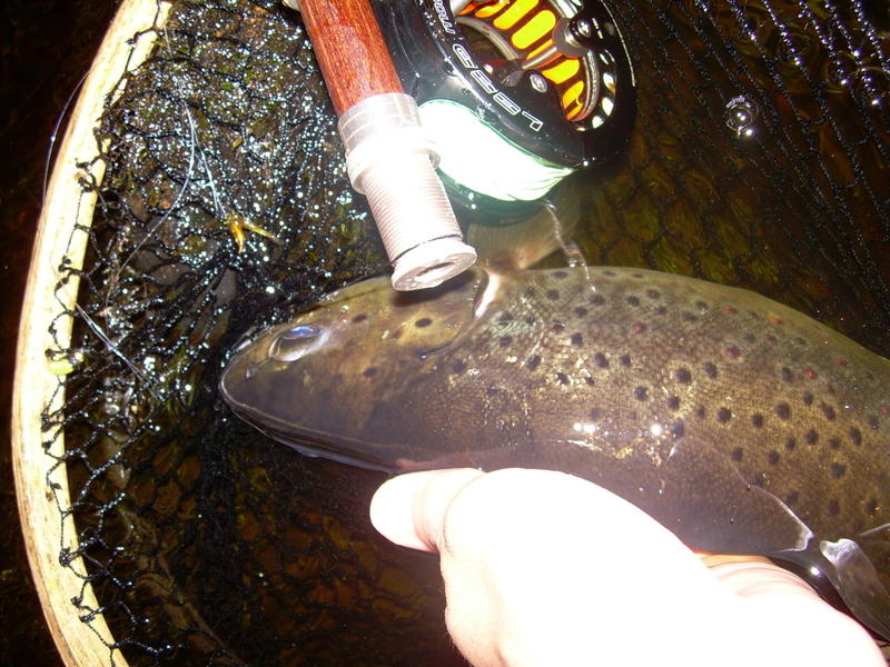Kahlasin kosken yli ja räimäisin perhot puolihuolimattomasti jonnekkin kuohuun. Niitä kun aloin sitten sisäänpäin vonkaamaan, niin vapa taipui jälleen.Tulisen taistelun jälkeen makasi haavissa kaksi rasvaevällistä taimenta! Toinen noin 45 senttinen, toinen pari senttiä alamittainen! Huh huh! Tämän jälkeen oli kalastus pakko lopettaa, sillä en saata kuvitellakaan, mitä sieltä vielä olisi tullutkaan...