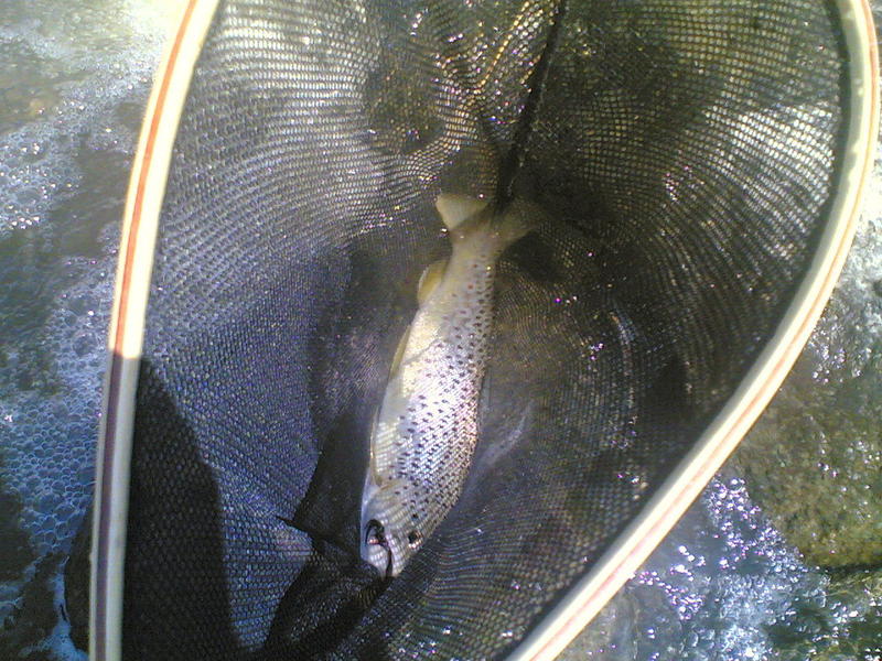 Kalastelin siinä padon alapuolella kun yhtäkkiä iski kala. Pirteä kaveri se oli, ilmassakin kävi. Ylöshän se lopulta tuli ja osoittautui yllättäen n. 35 cm taimeneksi, takaisin sukua jatkamaan.... Myöhemmin sain vielä kirjon maantiesillan luota.
