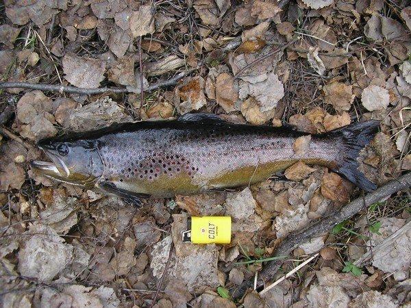 Eikä mennyt kuin pari tuntia jos niinkään kauaa, kun sain toisen taimenen ottamaan kiinni ja se oli ehkä hieman alamittainen joten päästin sen pois.