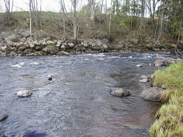 Kalakaverin saavuttua aloin menemään jokea alemmas ja vaihdoin perhoa "hieman" enemmän välkehtivään. Menin joen alta ylitte ja kävelin kalastellen alaspäin. Ajattelin, että montusta mikä oli mun edessä, niin siitä vois tulla kala. Ja niinhän sieltä tulikin!!! Annoin perhon upota hetken ja sitten jymähti! Tuntui, että perho olisi ollut pohjassa, mutta sitten kala rupesi juromaan pohjassa ja väsyttelin kalaa about 5 minuuttia ja Naava haavitti sen.