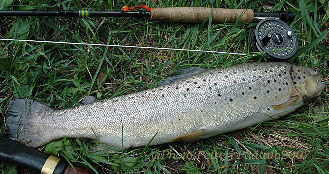 Kävin tsekkaan tilanteen ja noin kiloinen taimen saatiin rimpuiltua keskeltä koskea hengettömäksi.