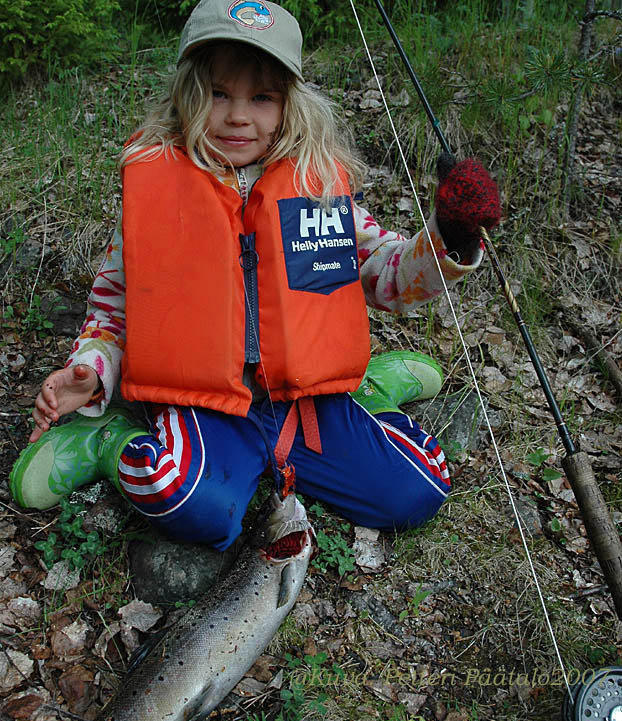 "Sini-Badger" ei kuitenkaa tuottannut toivottua tulosta ja niin istuimme tytön kanssa rannalla pällistelemässä. Korkeapaine ja täysi kirkkaus sai vaihtelua kevyestä pilvipoudasta ja se jos mikä piti nyt toiveita yllä. Tyttäreni katsoi rasiaani ja sanoi: "Laita iskä tuo perho" (osoitti Oulanka-sarjan perhoa no 10). En uskonut asiaan, mutta tottakai tytön kehoittamana solmin sen siimannokkaan. Pari minuuttia meni kun omilla "luottoperhoillani" onkimastani paikasta päsähti kunnolla kiinni. Vajaa 10min. ja tyttäreni haavi toisella yrittämällä vajaan 60cm komean pyyntikokoisen istarin!