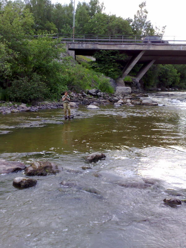 Käytiin ostamassa luvat, ja suunnattiin mustakoskelle, laittamaan kalastuskamoja kasaan. Siinä sitten kalastettiin jonkun aikaa. Kaverini sai melko nopeasti päivän ensimmäisen kalan, jonka otti ruokakalaksi kotiin. Siinä jonkun aikaa kalasteltiin, ilman tärppejä. Päätettiin antaa paikan vähän rauhottua, muutenkin alkoi jo nälkä kurnia. Käväistiin siinä pizzeriassa, syömässä kebabit ja suunnattiin siitä muurille päin. Eipä tullut muurilta, eikä moottoritien sillan, alapuolisesta montusta mitään. Lähdettiin mustakoskelle vielä käymään, mutta tuloksetta. Pikku hiljaa alkoi ilma vähän viiletä, ja menimme vielä kokeilemaan moottoritien viereisen montun niskan, ja alempia monttuja. Jonkun aikaa siinä niskalla heittelin niin kala pamahti koukkuun. Otin kalan mukaan. Vähän aikaa kalastettiin, mutta tuloksetta. Pakattiin kamat ja lähdettiin kotiin.