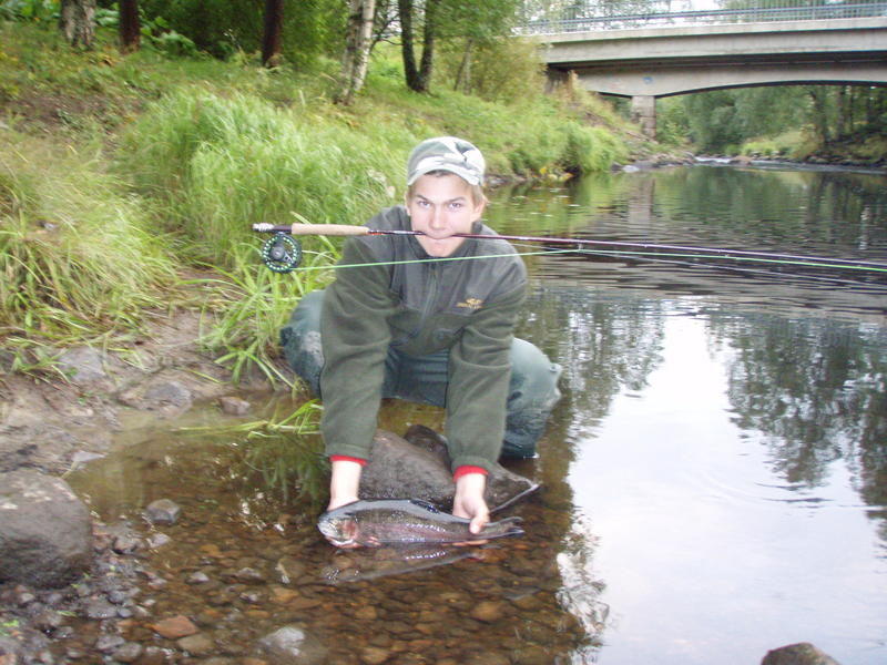 Kotijoelle tuli tehtyä reissu kavereiden kanssa pitkästä aikaa. Kalaa joessa oli joten munien puolesta ei tarvinnut pelätä. Mutta hymy alkoi hyytymään kun kalat eivät kertakaikkiaan ottaneet kiinni vaikka nokan edessä uitti. Kaveri sitten vihdoin ja viimein onnistui saamaan perus kirjon rannalle. Illalla hämärissä myös minua onnisti kun huomasin, että perhoni perässä oli pyörteen joten uusi heitto ja pam kala kiinni lyhyt väsyttely ja haaviin. Sitten olikin hyvä päättä kalareissu siihen, kun alkoi ukkos myräkkäkin painaa päälle.