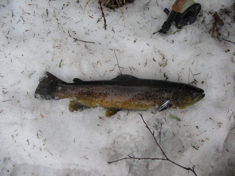 Puolen päivän jälkeen ilma alkoi lämmetä, kun pilviverho raotti taivaankantta näkyviin. Samalla myös tuuli tyyntyi hieman, mikä lisäsi hyönteiselämää hienoisesti. Pintovia kaloja ei kuitenkaan näkynyt vieläkään. Hieman ennen kahta rasiasta oli käytetty jo liki kaikki mitä löytyi, kunnes päätin sitoa perään vielä Hotan perhokalastajat-netissä esittelemän salakkajäljitelmän. Itse kyseisen kaverin sitaisin kuitenkin streamerikoukkuun. Vaihto kannatti, sillä jo kolmas heitto toi tuloksen ja kello 13.50 kaunis 47 senttinen taimen sätki keväthangella.