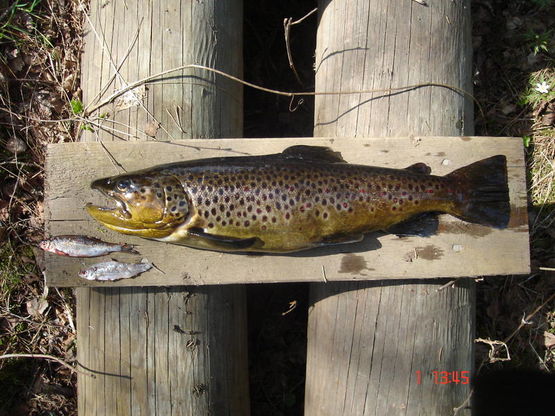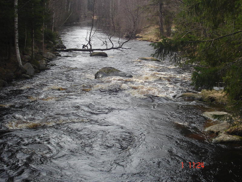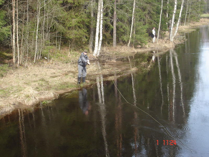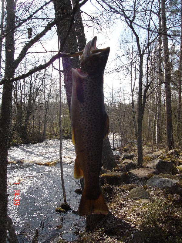 Oltiin perjantaina ekaa kertaa vallottamassa kihniön taimenkoskia. Aloitettiin kalastus n.10.00 muita kalamiehiä ei näkynyt. Koski oli melko kapea, risukkoa paljon ympärillä ja isoja kiviä paljon. Aamupäivästä pieni kosketus kalaan, mutta karkuutus. Tämän jälkeen kaverin liitsiin tälläsi ison kiven taustalta 46cm taimen. Taimen oli pullollaa pikku kalaa yht. 14kpl. Kala rannalle ja samantien pullahti pari ensimmäista pikku kalaa suusta. No ei muuta kun liitsiä siiman päähän ja 20m alempaa saman kaverin vapa taipui taas, hieman laihempi Taimen oli, mutta mittaa kuitenkin 45cm. Tämän jälkeen yksi Taimen kävi vielä kolmeen eri perhoon tökkimässä, mutta ei suostunut jäämään kunnolla kiinni. Päivä oli paketissa ja uusi paikka tuntui hyvältä mestalta. Kalaakin tuntui joessa olevan hyvin, vaikka sitä ei tänä keväänä sinne viellä oltu istutettu. sen pituinen se!