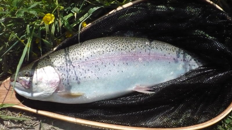 Seuraavana aamuna tulimme noin kello 7 takaisin koskelle. Ylhäällä ei ollut liiemmin tapahtumia, joten siirryimme koulun suvantoon. Jonkun aikaa perhoa heiteltyäni sain kirjolohen nappaamaan pieneen oranssivihreään streameriin ja reilu viiden minuutin väsyttelyn jälkeen kala oli haavissa. Paino oli noin 1,2kg ja pituutta kertyi 41cm. Kala lähti pirteänä takaisin koskeen.