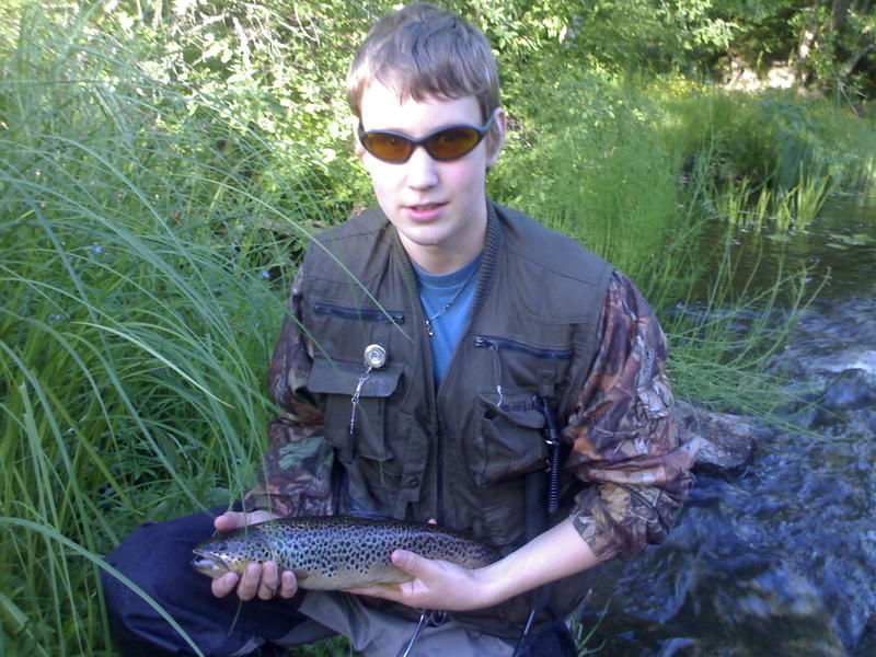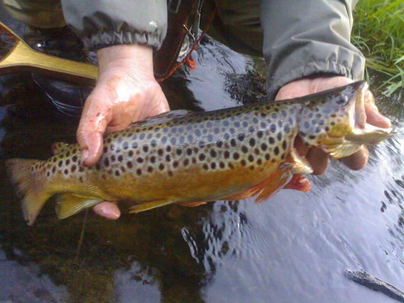 Jatkoin kalastusta alavirtaan. Ennen ensimmäistä suvantoa muutama kala kävi yrittämässä perhoani. Kalastin suvannon ja jatkoin alaspäin.. Toiselle suvannolle päästyäni ja joen ylitettyäni ei kalaa kuulunut. Jatkoin kalastusta loppuliukuja edeltävään koskipätkään. Siellä Alkoi tapahtua, koskesta Matuka-Salakkaani oli tarrannut todella pirteä ja hyvän kokoinen taimen. Hetken sitä väsyteltyäni kaverini otti sen haaviinsa. Näin oli ensimmäinen kierros koskea koluttu ja päätimme pitää tauon. Kaverini ja hänen isänsä eivät tähän mennessä olleet saaneet mitään.