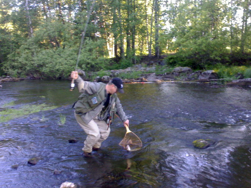 Jatkoin kalastusta jolloin nappasi, mukavan pirteä taimen kelpuutti pupani vastarannalta pienestä kuohusta. Kaverini isä oli siirtynyt yläpuolelleni ja alkoi kalastamaan yläkoskea keltaisella larvalla. Sieltä hän nosti vielä yhden taimenen, mutta päästi sen takaisin kasvamaan. kello 23.45 lopetimme reissumme ja lähdimme autolla kohti kotia.
