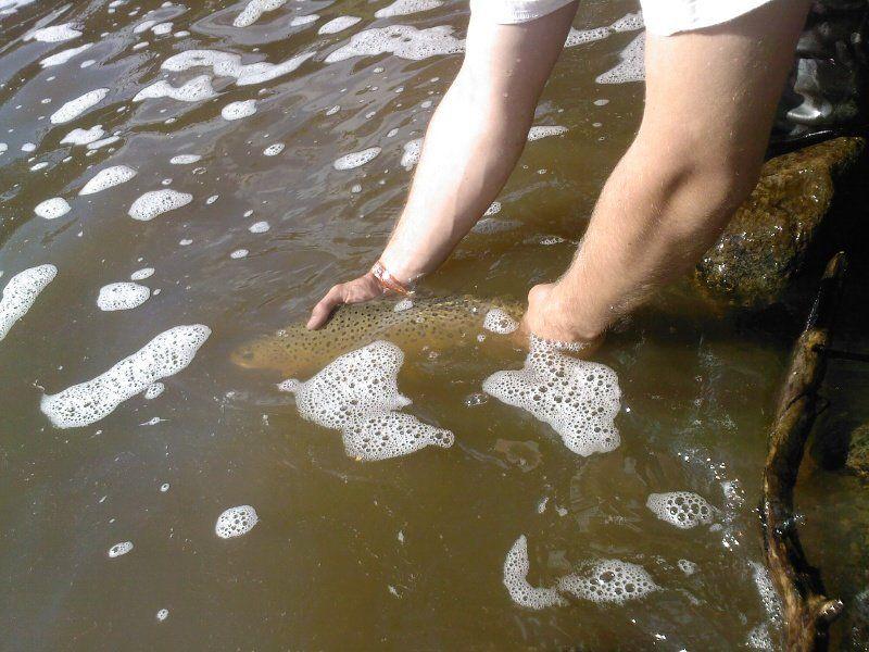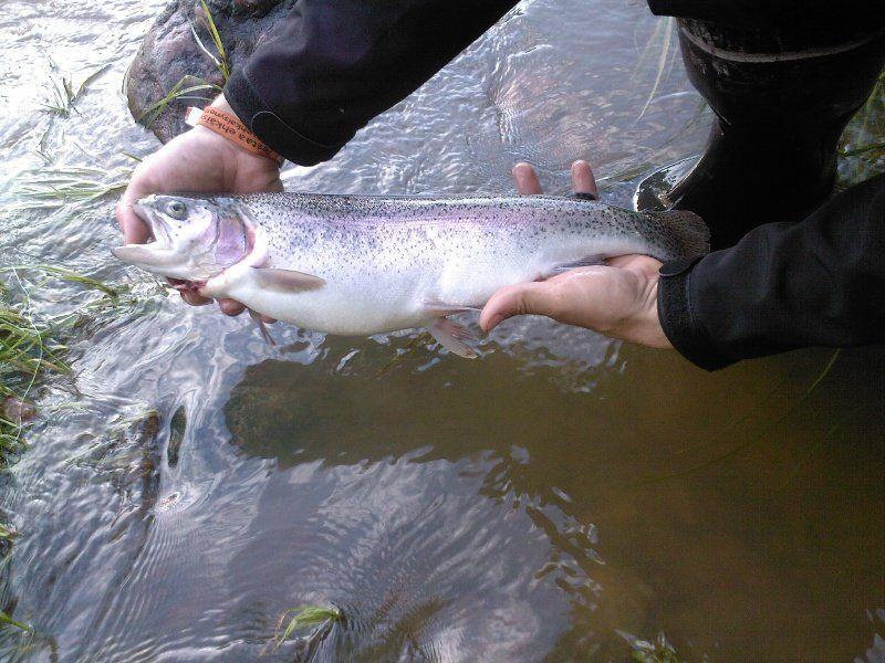 Hieno sää kalastella. Ensin tuli kirjolohi joka päätyi ruokakalaksi. Hetkeä myöhemmin 50cm taimen joka pääsi jatkamaan matkaansa. Kummatkin punamustalla leechillä larvastustyylillä. Kalastajia oli aika paljon, mutta ei onneksi tungosta. Veden korkeus oli juuri sopiva. Muutama isompi kävi myös pinnassa polskimassa.