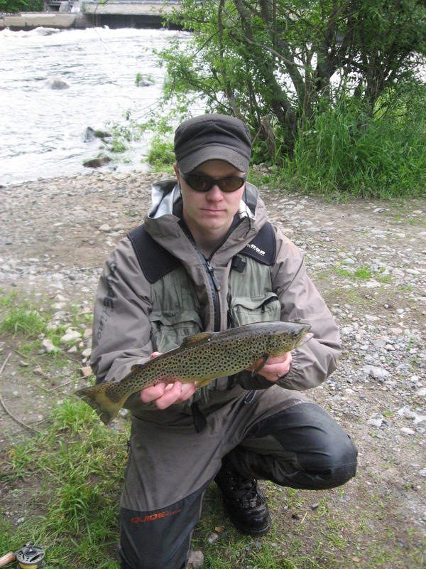 Kalakaverini Jaakon kanssa saavuimme kuudeksi viantaan ja veden tulo oli kyllä päätä huimaava. Kumminkin apinan raivolla tulta päin ja kahlaten niin pitkälle kun uskalti ja heittoja virran mukaan. Ensin puoli pakkia perhoja pohjaan jonka jälkeen vaivasi pieni harmitus mutta kesken pahimman ärsytyksen iskikin kala, joka osoittautui mitta taneksi. Parin tunnin päästä samaiselta kohdalta iski myös kirre josta kehnohko kuva alhaalla..
