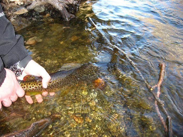 Nyt luvat sain...ei siinä muutakun pari kaveria mukaan ja taimenen pyyntiin. Olosuhteet olivat kaikin puolin kunnossa. Lämpöiset kelit edellisillä viikoilla oli nostanut veden lämpötilan jo lähemmäs yhdeksää astetta ja vesikään ei ollut vuodenaikaan nähden korkealla. Lauantaina koskelle suunnisti kaksi paikan ensi kertalaista maustettua yhdellä kokeneella kehäketulla. Edellisenä päivänä koski oli antanut yhden yli 60 cm ja muutaman muun pienenmän kalan lähinnä niskan alueelta. Sen verran oli kalastus paineita talven aikana kertynyt että ensimmäinen tunti meni perhostaessa ilman "järkiä". Järjen palatessa alkoivat kaksi ensi kertalaista itse mukaanlukien keskittämään kalastuksen sillan yläpuoliselle alueelle "konkarin" kolutessa vanhoja otti paikkoja läpi.
