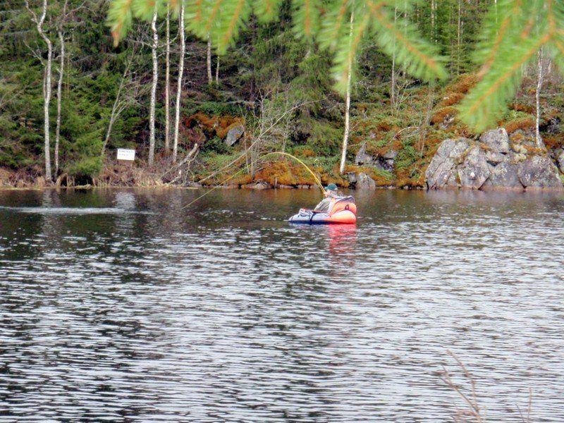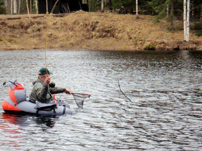Pikku ruokatauon jälkeen pumppailin renkaan täyteen ja lähin kellumaan. Kalaa nousi tasaiseen tahtiin, pääasiallisen saaliin ollessa kilon-puolentoista kirjolohi. Puolen päivän jälkeen sitten vapa notkahti raskaasti ja pitkä vääntö kalan kanssa alkoi. Heti tärpistä kala lähti syöksyyn sillä seuraksella että kelalta hävisi pohjasiimaakin n. 15 metriä. Kymmenkunta minuuttia myöhemmin haavin pohjalle heilahti n. 60cm ja kolmikiloinen kille. Taistelun tiimellyksessä kala oli ottanut pohjasta mukaansa metrisen risun. Keskimmäinen perho oli risussa kiinni ja kala alaperhossa. Tämä hiukan vaikeutti haaviamista...