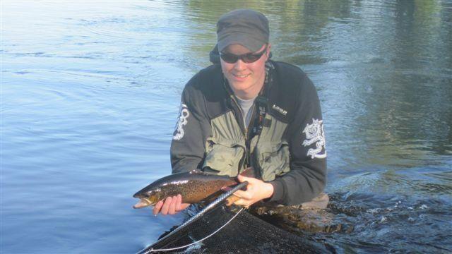 Paikat niskalla vaihtuivat. Äskeisen johdosta hankkija siirtyi taka-alalle jä päästi minut niskan pelipaikkaa kokeilemaan. Muutamien heittojen sisällä jouduin maksamaan oppirahoja liian ohuesta perukkeen kärjestä, kun kovimmasta niska imusta tuli raju taimenen isku ja siima kerrasta poikki. Huulien pureskelun ja tupla paksumman kärjen vaihdon jälkeen, pujotan siimaan Ike nimim. omistaman perhoreseptin, simo silakan kopion kehiin. Viereinen imu, raju tärppi, kiinni on! Tuiman jumputuksen saattelemana herää ajatus kunnon kalasta. Ei kuitenkaan, virkeä 46cm taneli haavin ja kuvien kautta kotikiven kupeeseen kasvamaan.