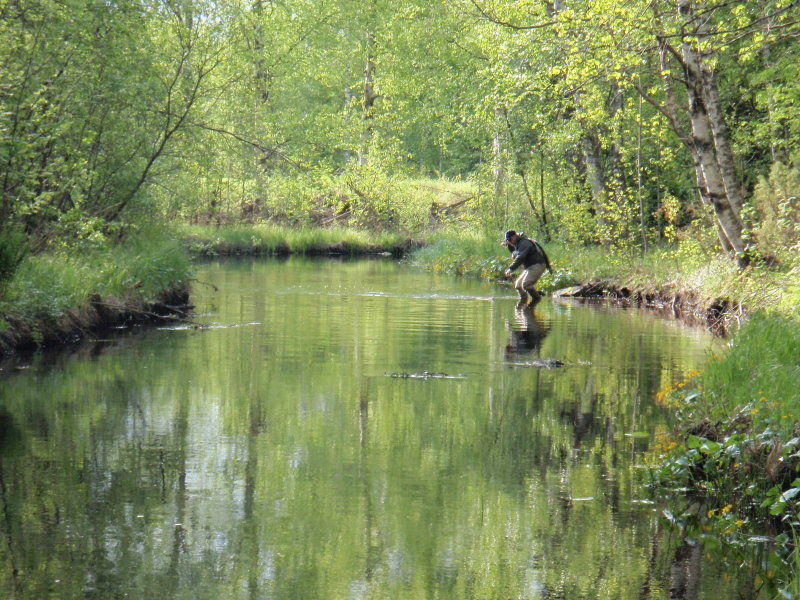 Tunnin verran joen alaosaa kalastettuamme lähdettiin käymään ylävirralla. Sieltä ei kaloja tuntunut löytyvän, tarkasta haravoinnista huolimatta. Edes pintakäyntejä ei ylävirralla näkynyt. Ilmeisesti kalat sieltä olivat laskeutuneet alavirralle, koska sinnekkin kalaa oli viety. Ensimmäinen tunti alavirralla antoi minulle kymmenkunta killeä haaviin asti, muutaman karatessa. Kaveri taisi käyttää haavissa "vain" kaksi kalaa, mutta karkuutti ison kasan.