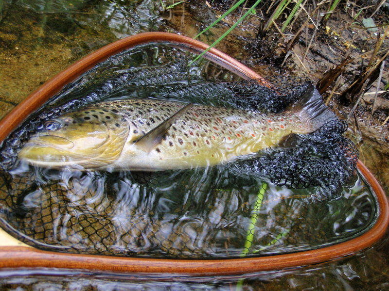 Aamu alkoi todella rivakkaan tahtiin, kun jo ensimmäisellä heitolla perhoa vietiin. Kovien hyppyjen, pienten syöksyjen ja tovin juromisen jälkeen haavin pohjalla pötkötti ensimmäinen kirjolohi, reilun kilon painoinen, hyväkuntoinen pötikkä. Kaverin vielä viritellessä peruketta otin muutaman askeleen alavirtaan, heitin, ja kala kiinni. Samanlaiset kuviot esitti tämäkin kala ja parissa minuutissa samanmoinen kille haavissa. Kun kaverikin jo väsytti kalaa hieman ylempänä, alkoi homman juju pikku hiljaa paljastua. Kalat oli jokeen tuotu neljä päivää aikaisemmin. Sinne tänne ripottelusta huolimatta kalat olivat jumittaneet parviin ympäri jokea. Kohdalle kun sattui niin kaloja nousi useita aina samalta paikkaa.