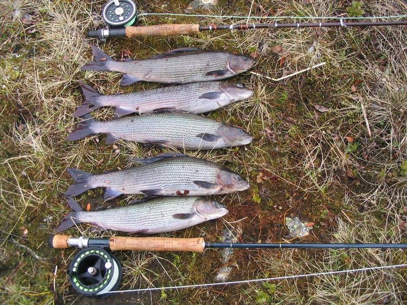 Pääasiassa kalastimme Pinniskosken aluetta joka osoittautui mukavaksi paikaksi. Harjusta tuli ja paljon. Paras suoritus taisi olla 5 heittoa 4 kalaa. Yhteensä viikon aikana koukutimme noin 70 kpl harjuksia ja yhden alamittaisen taimenen. Yksi isompi taimen oli kiinni mutta oli tällä kertaa kalastajaa viisaampi. Harreista vain muutama oli alle 35cm, pääosin harrien koko oli 40cm suurimman ollessa 46cm.
