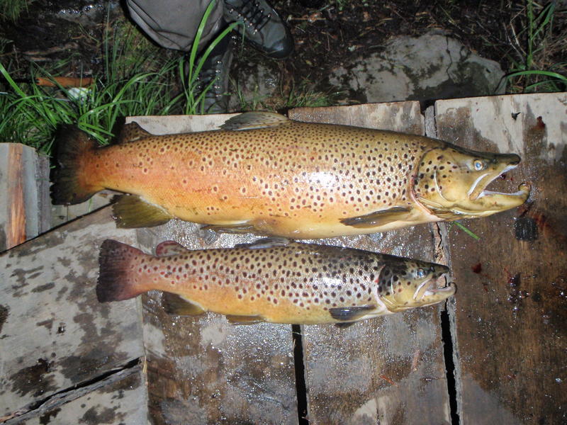 Pienen lepäämisen jälkeen lähdimme taas Leveänkoskelle yökalaan. Koskella törmättiin taas jo tuttuihin sawolaisiin. Heidän lisäksi paikalla oli myös kaksi muuta kalastajaa. Janne kahlasi toiselle puolelle ja Olli jäi laavun puolelle. Heti alkuun Janne sai niskalta sären avulla 3,2 kg hauen, joka lähti kalapihvi tarpeiksi jäpä k:lle. Kello läheni puoltayötä ja olimme jo tekemässä laskua alemman pikkusaaren kohdalla. Janne lirkki tuttuja ottimonttuja ja tartutti kalan, jonka hän kuvitteli ensin olevan hauki rauhallisten potkujen takia. Lopulta Janne karjaisi, että ”Nyt on hyvä taimen!” Taimen lipui 10m koskea alaspäin ja lopulta otus koukattiin haaviin sotahuutojen kera. Samaan aikaan Olli onnistui koukuttamaan 51cm taimenen larvalla. Menimmekin saman tien kalojen kanssa laavulle. Ensiksi muut ihailivat Ollin taimenta, mutta Jannen tullessa toiselta puolelta, katseet kääntyivät toiseen taimeneen. Tämä taimen mitattiin 72 senttiseksi ja puntari näytti 4 kiloa. Kummasteltuamme kalaa pari tuntia, lähdimme vaunuun rauhoittumaan. MELEKONEN YÖ!!!