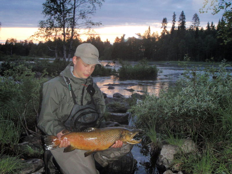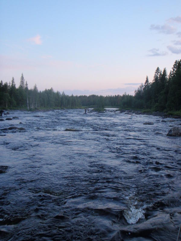 Loppu päivä levättiin yötä varten, nimittäin päätimme lähteä katsomaan Leveänkosken tilanteen. Koko päivä oli ollut suht lämmintä ja arvelimme kalan syövän paremmin yöllä. Klo kymmenen maissa koskella oli meidän lisäksi 8 muuta kalastajaa ja kolme näistä olivat tulleet myöskin sawosta päin. He kertoivat, että kalantulo oli ollut hiljaista, muutamaa harjusta lukuun ottamatta. Kalastuksen aloitimme niskalta ja parin heiton jälkeen Janne tartutti taimenen. Kala pinkoi alavirtaan päin ja lopulta se suostui haaviin. Pituutta kalalla oli 40cm ja tämä pääsi takaisin omaan elementtiinsä. Taimenen ja muutaman hyvänkin harrin lisäksi, muuta mainittavaa saalista ei tullut. Aamu kuudelta saavuimme tukikohtaan nukkumaan.