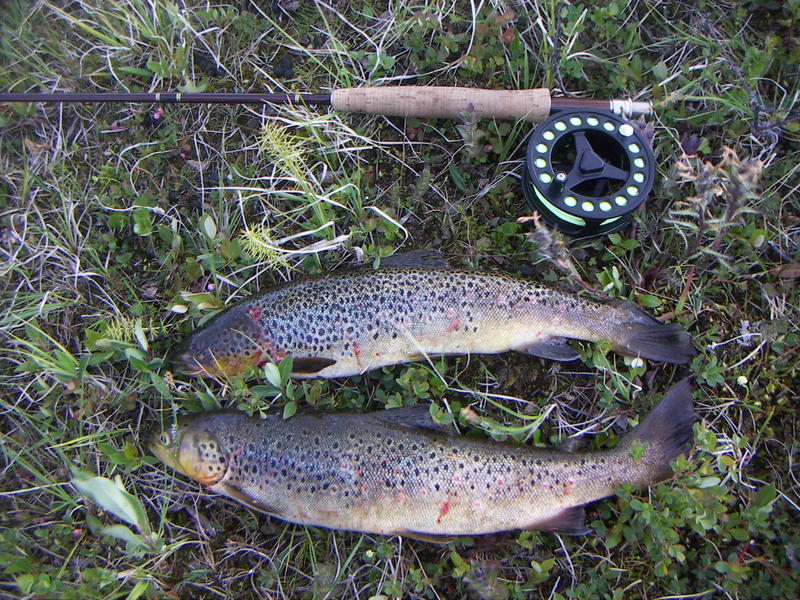 Komea (vai pitäisikö sanoa kaunis kun kyseessä oli naaras?) taneli nousi rantapenkalle ja pappi heilahti kuolettavasti. Laskin kalasta veret ja irrotin koukun ja siirryin muutaman metrin ylävirtaan ja jatkoin heittelyä. Noin kolmannella heitolla näin kuinka ruskea hahmo lähti nousemaan perhoani kohti ja nappasi sen pinnasta. Nopea vastaisku ja väsytys sai alkaa. Tämä pisti enemmän hanttiin kuin edellinen ja juroi pohjassakin muutaman minuutin ennen kuin antautui haavittavaksi.