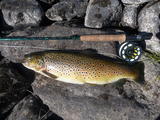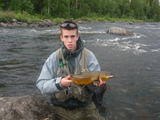Taas päivä avattii Leveänkoskella. Aamulla ei tullu mitään, mutta illal sitten vaihteeksi kaloja rupesi näkymään. Ekaksi sain 45 cm taimenen ja sitten oli vähän aikaa hiljasta. Sitten iskällä oli taas vapa ihan kaarella. Pienen väsytyksen jälkee 1,9kg 52cm läski taimen makasi rannalla.