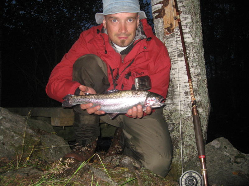 Myöhäisemmällä illasta siinä kosken laiturin luona iski vihainen kirjo vielä kiinni mustaan oranssi kauluksiseen liitsiin kiven edestä, jkalan myös otin evääksi. Paino 0.9kg ja pituus 41cm(taisi olla uros väreistä päätellen, en tiä...)