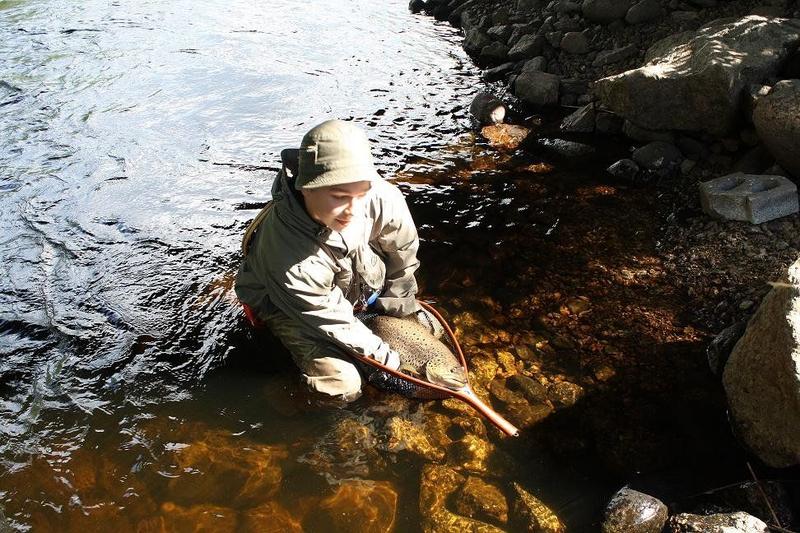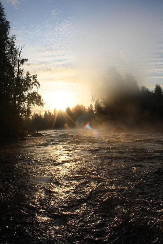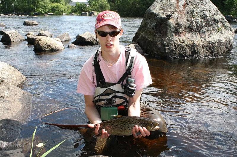 ''Poikia alkaa kyllä v*tuttaa ku nostan tarmo näillä sun vaapuilla kaloja, ja pojat pyytää perhovehkeillään tyhjää !'' Kuskin lauseen jälkeen auto starttasi ja mersun keula kohti huopanaa, uusien vaappujen haun jälkeen. Luvat haettiin kuuden maissa, ja eikun kosken rantaan ja kamppeita niskaan. Keli oli aurinkoinen ja tosi lämmin, eli ei antanut paljon odotuksia päivälle.. No, siinä kuitenkin litkaa kasaan ja larvoja siimanpäähän. Kävelin kosken rantaan ja tarkkailin koskea hieman. Torikosken molempia puolia kalasti ainakin 5 kalastajaa, joten päätin lähteä kosken alaosille. Kävelin vanhalle sillalle ja kuninkaanväylässä oli vain yksi kalastaja, eli sinne siis. Menin varovasti rantaan ja aloin larvastella kiventakusia koko kuninkaanväylän ylös asti, mutta ilman saalista. Niskalla vaihdoin tinselin siimanpäähän, ja kuninkaan väylän kalastin alas asti, taas ilman tapahtumia. Kuninkaanväylässä ei ollut siis mitään elämää. Kävelin ylös ja aloin kalastaa torikoskea kioskin vastarannan puolelta. Vain pari hyvää tärppiä larvoihin, ei muuta. Menimme pitämään taukoa, ja Krise oli saanut 48cm, 45cm luonnontaimenet ja 42cm istarin larvoilla, ja Jarmo vaapulla 43 cm harjuksen niskakoskesta. Illan aikana ei itselläni muuta elämää ollut kuin pari hyvää tärppiä ja ohihyppyä torikoskessa ja suvannossa mustaan streameriin. Sitten alkoikin olla jo niin pimeä, ettei nähnyt kalastaa, joten tulille makkaran paistoon. Kolmen maissa aloitin taas kalastuksen kun keli hieman kirkastui. Menin niskakosken niskalle, kahlasin kymmenisen metriä rannasta keskelle koskea. Kalastin pinturilla tarkasti niskaa, ilman tapahtumia. Harjuksia kävi paljon pintomassa, mutta ei pinturi kelvannut. Vaihdoin isoimman mustan streamerin mikä pakista löytyi, (+10 cm) ja aloin kalastaa niskaa. Ei mitään elämää. Käännyin ympäri ja heitin ihan rantakivien taakse, uitin perhoa hiljalleen ja siima pysähtyi nopeasti. Nostin vavan ylös, ja tunsin että nyt ei ihan pieni kala olekaan. Kala juroi minun ja rannan välissä parikymmentä sekuntia, jonka jälkeen hyppäsi ilmaan ! Se oli taimen, arviolta 50-55 cm. Hypyn jälkeen kala oli vielä pari sekuntia kiinni, ja naps, siimat silmille. Siinä muutaman(kymmenen) kirosanan jälkeen tarkastin siiman, niin se katkesi solmusta! Siinä hetken kivellä istuin ja vitutuksen hieman laskiessa aloin kaivaa pakkeja esille, etsien samankokoista mustaa streameria. Eipä sieltä tietenkään löytynyt läheskään yhtä isoa perhoa enään.. No, pienempää mustaa streameria kiinni siimaan ja jatkoin kalastusta, ilman tapahtumia. Aamuyöllä ei muita havaintoja kaloista, kuin yksi hyvänkokoinen, noin 50 cm taimen pyörähti isosta simpusta ohi kovassa virrassa, ja yhden taimenen spottasin maantiesillalta. Siinä aamupäivä kalasteltiin oikeestaan tyhjää, vain muutama tärppi ja karkuutus larvoilla niskakoskesta ja torikoskesta. Krise sai pari kalaa kuitenkin ylös asti. Mentiin pitämään taukoa, ja aurinko paistoi kirkkaalta taivaalta. Alkoi pikkuhiljaa mietityttään, että millä sen mittataimenen ylös asti tällä reissulla sais. Pistin kolme nymfiä, 2 kpl #18 ja ylimmäksi #14 koon nymfin, ja kipitin niskakoskelle. Menin rantaan, ja kävelin vedessä olevan kiven päälle. Tiputin perhot ihan jalkojeni eteen kiven viereen, ja välittömästi syöksyi taimen ylimpään nymfiini kunnon loikalla ! Säikähdin kauheasti, mutta onneksi ei vapa lentänyt kädestäni! Sillalla oli joku mies polkupyörän kanssa katsomassa kun väsyttelin kalaa, ja kuului huuto: 'jumankauta mikä taimen ! ' No, siinä jalat tutis ja kädet tärisivät, kun vapa oli aivan mutkalla ja siimat tiukalla. #14 koon nymfi, ohutlankaisessa väkäsettömässä koukussa, 0.20 perukesiimat ja kova virtaus. Pelkäsin ettei tuo kala kyllä kauaa kiinni pysy. Siinä hetken montussa vääntäessään, kala lähti sitten puolet niskakoskesta vauhdilla ylös. Juoksin kauheata vauhtia kivikossa sen perässä. Kala jäi ylös juromaan yhteen monttuun, ja sain rauhassa kahlata ylös sen perään. Sen lähelle päästyäni se sitten tajusi minun tulleen perässä, ja lähti kauheata kyytiä koskea alaspäin. Juoksin ja kompuroin sen perässä niin lujaa kuin pääsin, ja minun onnekseni kala jäi samaan monttuun juromaan, jossa se aluksi oli. Sillalla oleva mies kävi huitomassa kaveriani avuksi ja noin 10 minuutin väsytyksen jälkeen se tajusi vasta tulla. Kala meni noin 15 metriä alaspäin, jääden sillan alle virtaan vääntämään. Onneksi se ei tajunnut lähteä torikoskeen.. Rannalle oli useampi henkilö kerääntynyt katsomaan väsytystä. Ensimmäisessä haavimisyrityksessä huomasimme että kala oli ylimmässä perhossa kiinni, eli se hankaloitti haavimisen kannalta tilannetta huomattavasti. Toisella haavimisyrityksella saimme kalan haaviin. Menimme matalaan rantaveteen, punnitsimme kalan joka haavin kanssa painoi tasan 3.7 kg. Haavi painaa 200 g eli kalalle jäi painoa 3.5 kiloa. Mittaa sillä oli 59cm. Kuvien jälkeen päästimme taimenen takaisin omaan elementtiinsä. Sen jälkeen rannalla keräsin hieman motivaatiota että kiinnostuin taas jatkamaan kalastusta. Tuon jälkeen ei oikeastaan muuta ollut, kuin yksi hyvä kala, joka oli kiinni pari sekuntia ja pääsi irti. Krise koukutti torikoskesta vielä hienon 51 cm taimenen, jonka laskimme myös takaisin kuvien jälkeen. Juuri kun olimme lähdössä, niin jarmo sai myös yhden taimenen, 47 cm istari, jonka otimme ruokakalaksi. Siihen oli hyvä lopettaa reissu, vaikka lupaa olisi ollut ainakin 5 tuntia vielä jäljellä. Mukavat fiilikset jäi itselleni huopanasta, vasta toinen kerta siellä, ja ensimmäinen kerta matalalla vedellä.