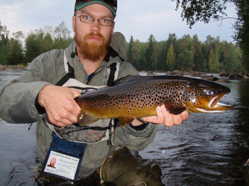 Kärmekaria aloin larvastella alhaalta ylöspäin. Pian haavissa kävi 20 ja 30 senttiset harrit. Kymmenkunta metriä aloituspaikasta vapa notkahtikin mukavasti. Monia syöksyjä, juromisia ja noin viisi minuuttia myöhemmin haavissa henkeä haukkoi 54 senttinen taimen. Pikakuvaus, kalan elvytys ja homman jatkui. Muutaman metrin ylävirtaan ja kala kiinni. Nyt oli ensimmäisessä vedossa menoa ja meininkiä. Lamsonin jarru rääkyi kun kala painoi alavirtaan. Vaan pikkuhiljaa kala sieltä palaili, kunnes haavi heilahti. Nyt haavissa muljahteli nelikymppinen todella paksu taimen. Ihmeen paljon oli ruutia tässä kalassa. Pian jo sitten pakkasin vavan ja suuntasin kotiin.