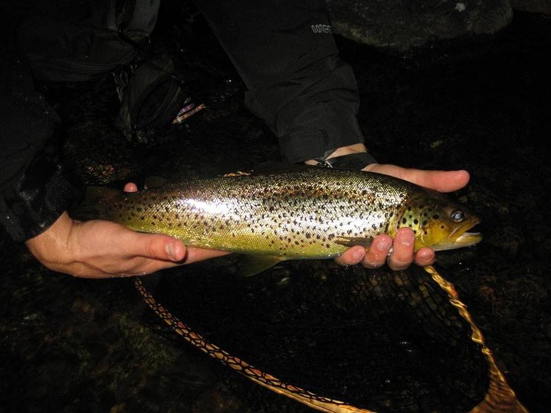 Vaikeaa oli kalan saanti kuin näissä paikoissa tahtoo aina olla ja ensimmäistä mitta kalaa sai odottaa aina hämärään saakka jolloin itselläni napsahti 46 cm ehjä eväinen taimen siiman päähän. Meno oli hetken niin hurjaa, että pieni pettymys kalan mitta. Hetkeä ennen kaverilla oli todellinen juna kiinni joka vastarannalta asiaa tarkasteltuna muutama kunnioitettava potkaisun ennen kuin päätti lähteä ja silloin 0,25 mm peruke oli paperia....Pimeyden laskeuduttua kosken yllä loppui ne vähätkin toiminnat ja näin ollen muutaman tunnin pimeässä kalastuksen jälkeen oli aika vetäytyä parin makkaran jälkeen unten maille.