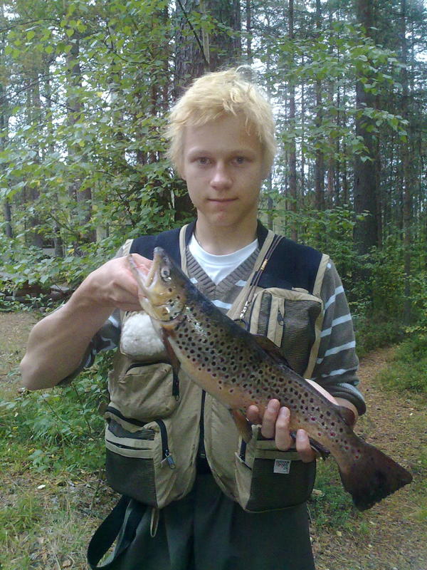 Lähettiin puolenpäivän maissa ajelemaan Ruunaalle katselemaan tilannetta ja sitten itse asiaan pääsimme siinä 6:n maissa. Serkku lähti koluamaan neitikoskea kun isän kaa jäimme vielä ylemmäs kalaan. Puolen tunnin heittelyn jälkeen lähdimme itse neitikoskelle. Serkku-poejjalla ei ollu ollut mitään niska-alueella, joten päätin siitä itse vielä koittaa. Jokunen puolisen tuntia siihen meni kun päätin että nyt Alder vaihdetaan leechiin. Ja näin lähdin ronkkimaan kovan virran reunaa. Ennenkuin huomasinkaan, niin jo joku oli leechissä ja juro ihan mukavasti vastaan. noin 5-8 min väsytyksen jälkeen haaviin nousi komea 46 cm taimen. Loppu ilta menikin sitten ilman tapahtumia.