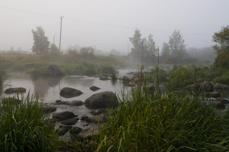 Aamulla lähdin puoli seihtemän junaan, Pakarista luvat, ja seiskan jälkeen olinkin jo kalassa. Ilma oli aivan tyyni ja sumua oli reilusti. Keskiuomaa piiskatessani haikara istahti parin metrin päähän kivelle. Heti kun huomasi meikäläisen, niin lähti kyllä vilkkaaseen karkuun. On se muuten aikas mahtavan kokonen lintu. Meinas tulla isollakin miehellä housuun, kun tosiaan parin metrin päähän istahti.