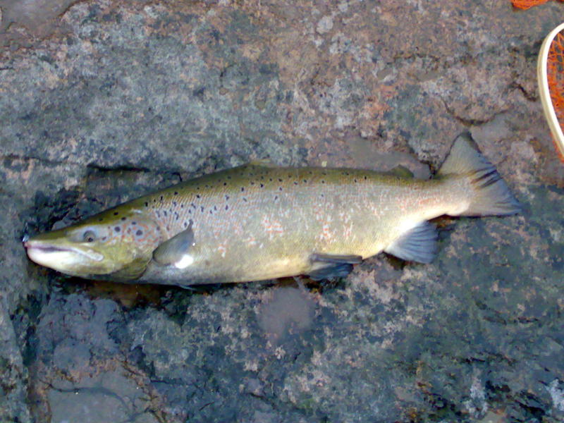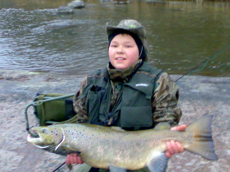 Joskus kymmenen aikoihin lähdettiin ajelemaan Langinkoskelle ja haettiin luvat Risto Rämän huoltoasemalta.Sitten ajoimme Langinkosken parkkipaikalle ja kasasimme kamat ja menimme Langinkosken yläpäähän.Heitimme siellä jonkun aikaa ja siirryimme alemmaksi jokea.Olin tulossa Laattakalliolle kun isäni yritti huutaa jotakin.En kuullut kosken kohinalta yhtikäs mitään.Sitten huomasin että hänellä oli kala kiinni.Heitin vavan pusikkoon ja lähdin juoksemaan Laattakalliolle päin .Ensin meinasin vahingossa kahlata syvän puolelta kalliolle.Luulin että hänellä oli kirkas meritaimen kiinni.Kun pääsin kalliolle otin jo haavin valmiiksi.Turhaan.Kalan väsytys kesti n.20 min.Kun näin kalan pyrstön ensimmäistä kertaa,tiesin heti että se on tumma lohi.Kun kala oli väsynyt ja tuli suosiolla matalaan veteen, niin nostin sen rannalle pyrstön tyvestä.Sitten otimme pikaisesti kuvat ja mittasimme kalan ja laitoimme sen varovasti takaisin veteen.
