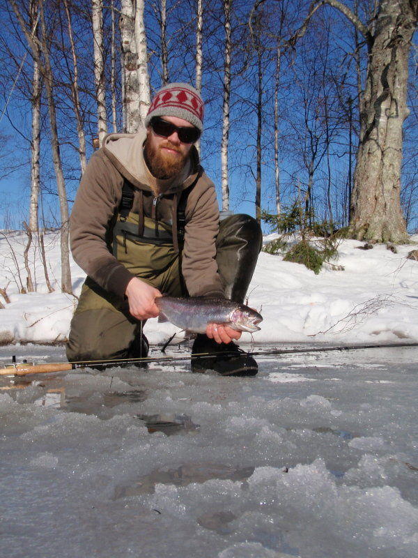 Kymmenen aikoihin, eväsleivän jälkeen, siirryin tarkastelemaan josko alasuvanto olisi kalastettavassa kunnossa. Olihan se ja pian oli ensimmäinen kirjolohikin kiinni. Vaan kun karkasi, onneton. Seuraava heitto samaan koloon vastarannan jäässä, kymmenen sekunnin upotus ja heti kala kiinni. Nyt pysyi ja pian vajaan kilon kirjolohi pääsi kokeilemaan Moran terävyyttä. Muutama tärppi vielä ja vaihdoin toiseen vapaan jossa odotti pikkuperhot. Rullaus vastarannan jään reunaan ja perhot valumaan virrassa. Parin heiton jälkeen indikaattori sukelsi ja siima kiristyi. Nyt oli jo parempi kala kiinni, ja parin minuutin suostuttelun jälkeen haavissa potki n. puolitoistakiloinen kirjolohi. Jänökuula oli maistunut. Hupia aiheutti haavimisen yhteydessä koettu rantajään pettäminen ja talviturkin heitto... Tämäkin kala pääsi kylmälaukkuun